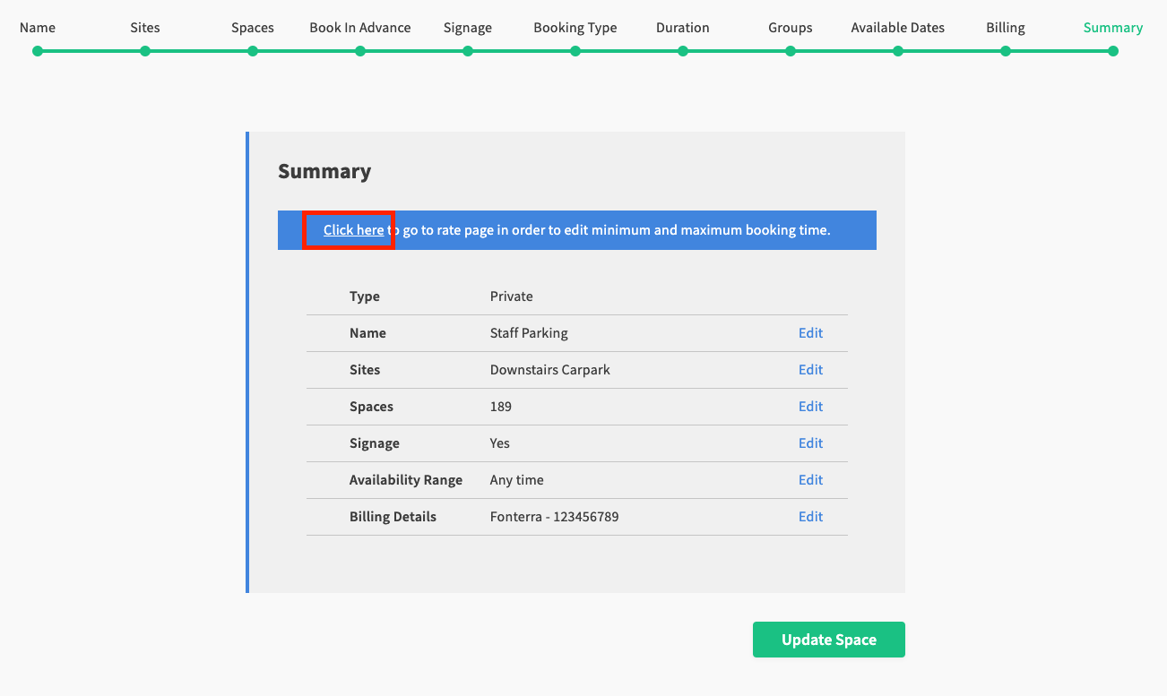 The blue banner at the top of the summary allows you to edit the booking rate. Click the 'Click here' text.