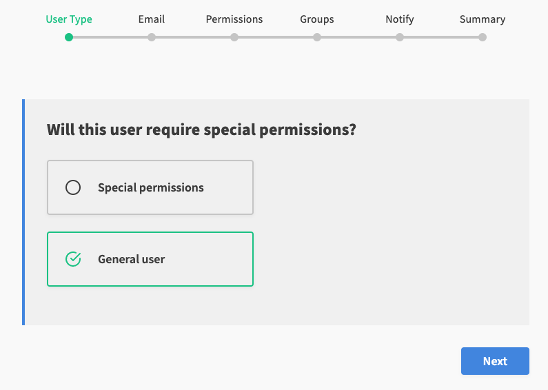 In this case, the user you add will not have special permissions. Therefore, select the 'General User' option.