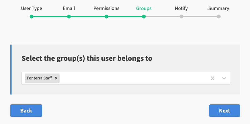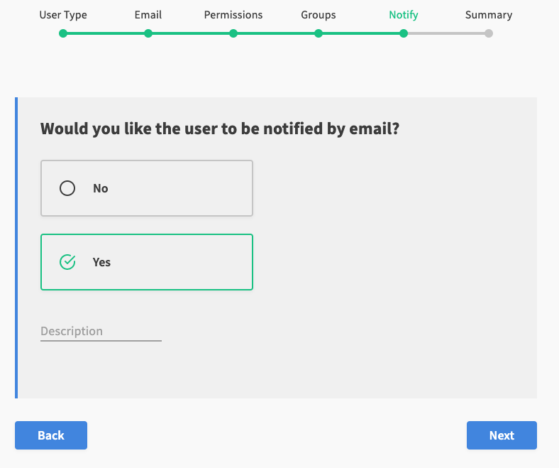 Select a notification option. Then click 'Next' to go to the summary pane and confirm adding the user.