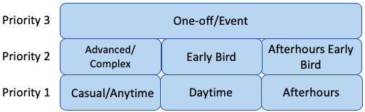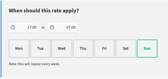 This rate type should be used to impose a specific pricing rate for a specific continuous time/date period. An example might be a special price for people attending a convention e.g. Comic-Con. A start and end date/time is required. This rate will apply over a day time or casual/anytime rate on the day of the event.