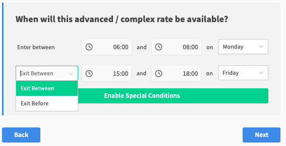 The After Hours Early Bird rate requires you to set conditions for parkers to meet to redeem the rate. An after hours early bird rate requires that the parker enter and exit between set periods, but unlike an early bird rate, this can span midnight.